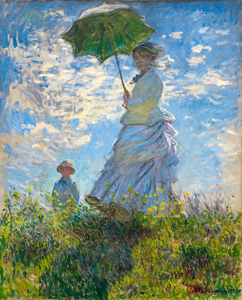 背光站在山丘上,轉過頭來看著畫家的莫內夫人卡蜜兒,臉上帶有淡淡的笑意,一旁年方7歲的兒子,由於站得比較遠,似乎展現出好奇的樣子探望著山下作畫的畫家。此情此景,記錄了一家人出外踏青的景象,光影的表現說明了印象派作畫的主旨,以戶外光線、天然的景致、風的流動、微微揚起的裙擺,描繪出夏日出遊一景。