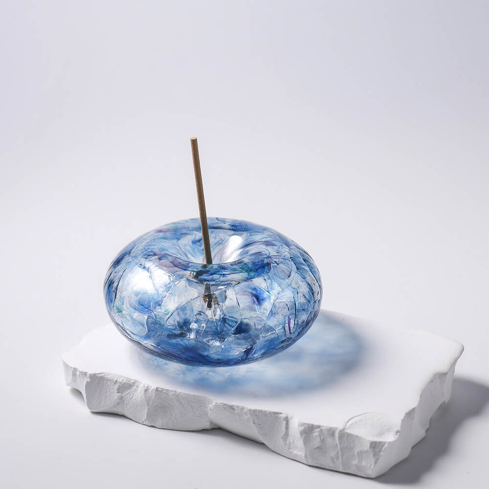此作將童年記憶中的肥皂泡泡轉化為實體的玻璃藝術品,圓潤飽滿的造型既是線香座,也是光影的載體。
