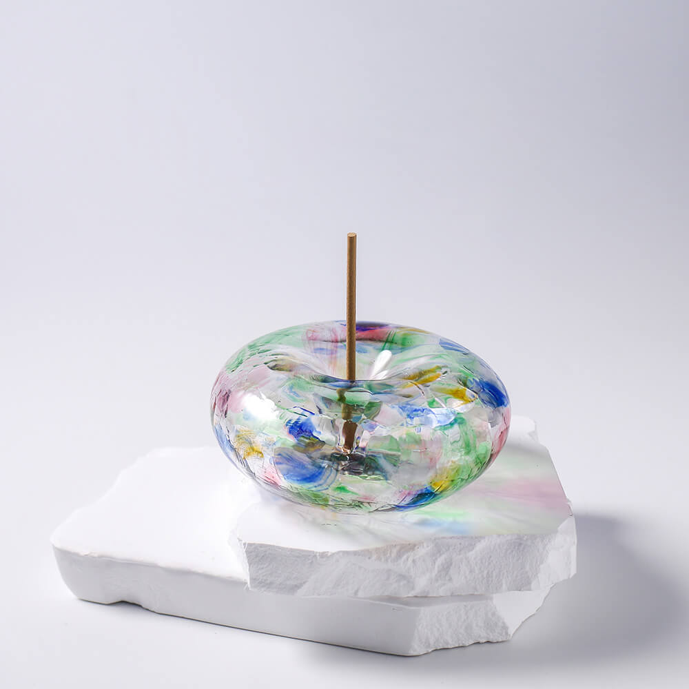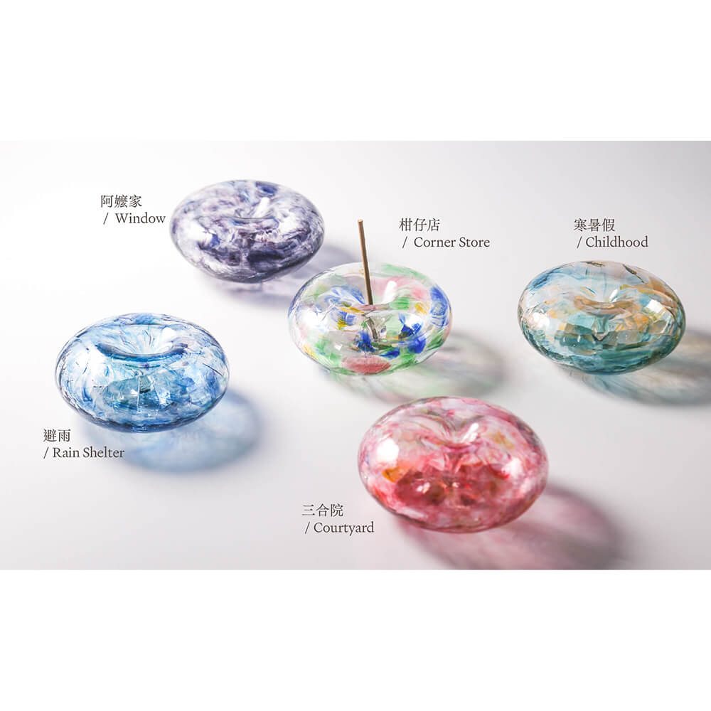 此作將童年記憶中的肥皂泡泡轉化為實體的玻璃藝術品,圓潤飽滿的造型既是線香座,也是光影的載體。