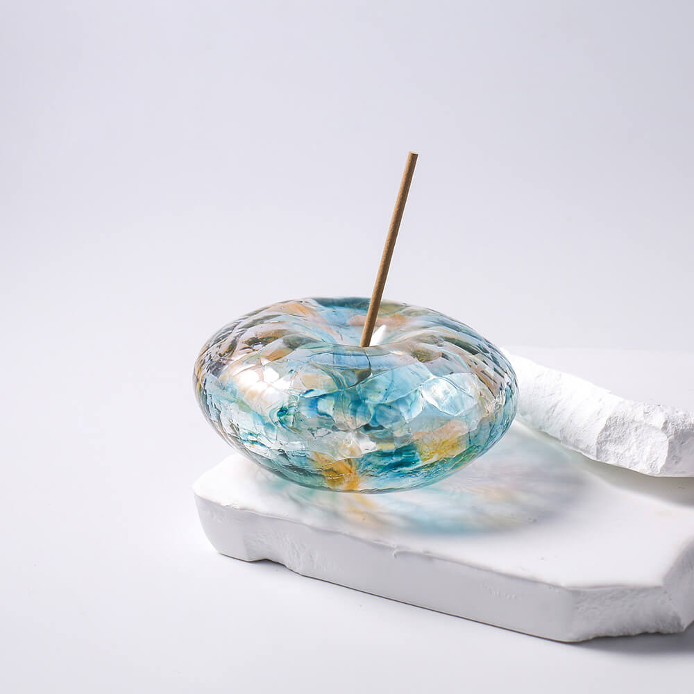 此作將童年記憶中的肥皂泡泡轉化為實體的玻璃藝術品,圓潤飽滿的造型既是線香座,也是光影的載體。